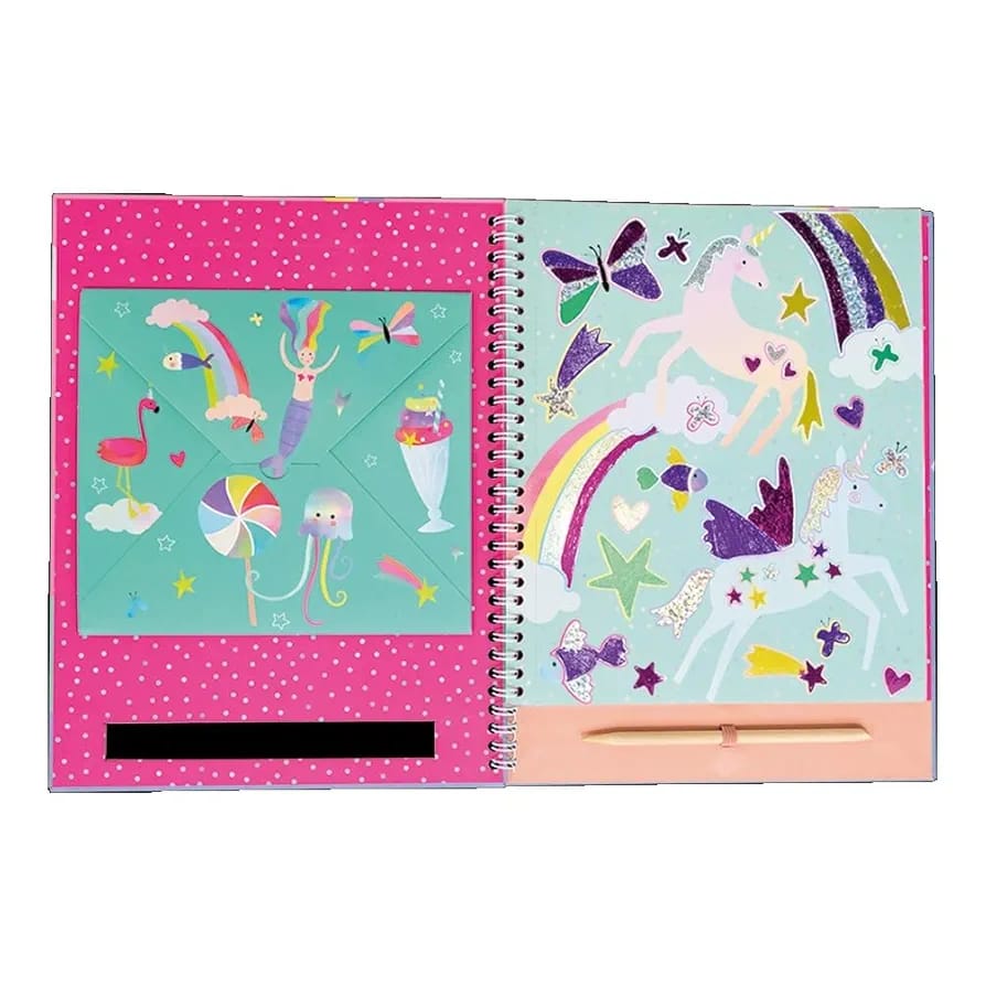 Laat alles glinsteren en schitteren met 8 leuke geïllustreerde pagina's om te versieren! Verwijder een witte sticker, kies een vel folie en wrijf het met de houten stylus op het stickergebied om een geweldig plaatje te maken! Dit zeemeermin-ontwerp bevat 20 folievellen in verschillende kleuren, 8 pagina's en een houten stylus - allemaal in een handig spiraalgebonden boek.