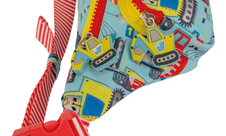 Het dinosaurusontwerp heeft twee grove, dinosaurusvormige ritstrekkers, twee handige compartimenten en een verstelbare riem van prachtig gestreept materiaal. In de tas zit een mooie dinosaurusprint en een 'Ik behoor tot...' label voor personalisatie.
