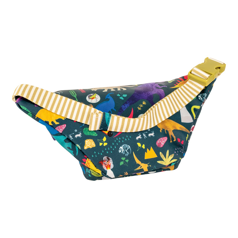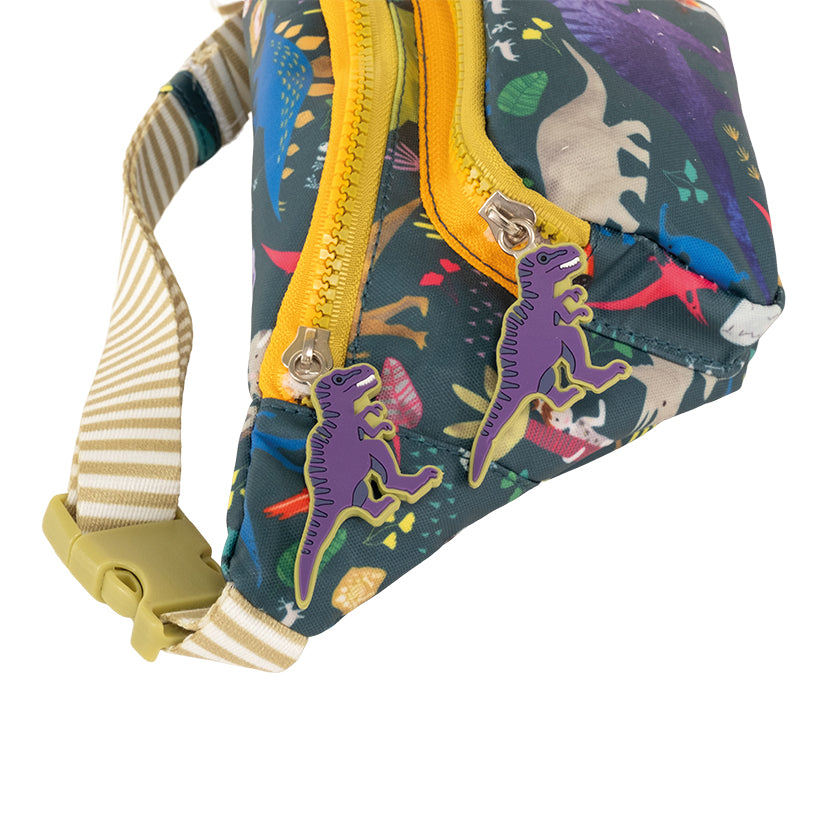 Het dinosaurusontwerp heeft twee grove, dinosaurusvormige ritstrekkers, twee handige compartimenten en een verstelbare riem van prachtig gestreept materiaal. In de tas zit een mooie dinosaurusprint en een 'Ik behoor tot...' label voor personalisatie.