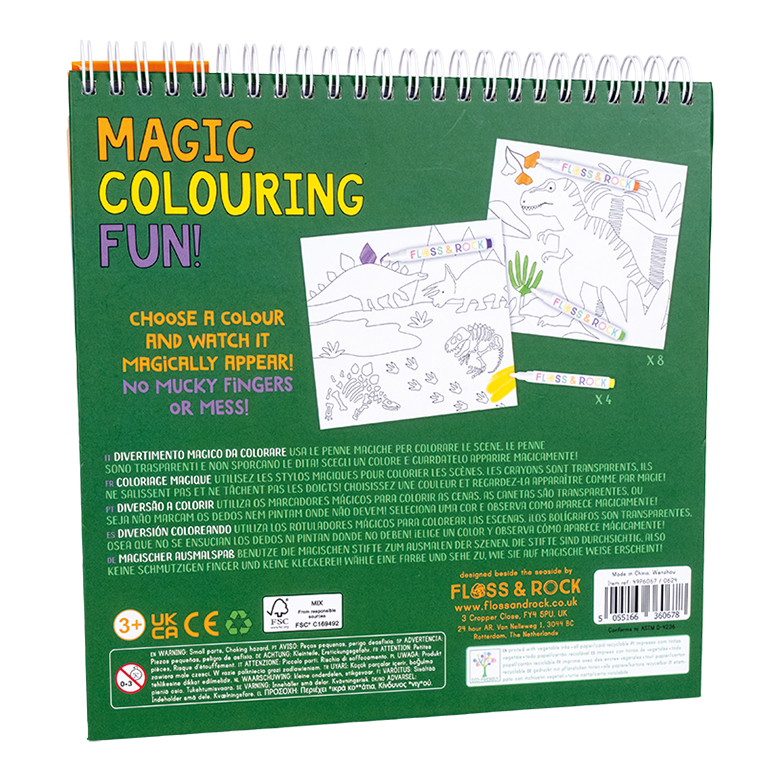 Zeg vaarwel tegen vieze vingers en rotzooi... Deze magische kleurstiften hebben onzichtbare inkt die alleen op de superleuke pagina's verschijnt! Kies een kleur en zie hoe deze op magische wijze op de pagina verschijnt. Elk spiraalgebonden blok bevat 4 magische pennen en 8 kleurpagina's, dit dino-ontwerp heeft al je favoriete dinosaurussen, holbewoners, vulkanen en meer...