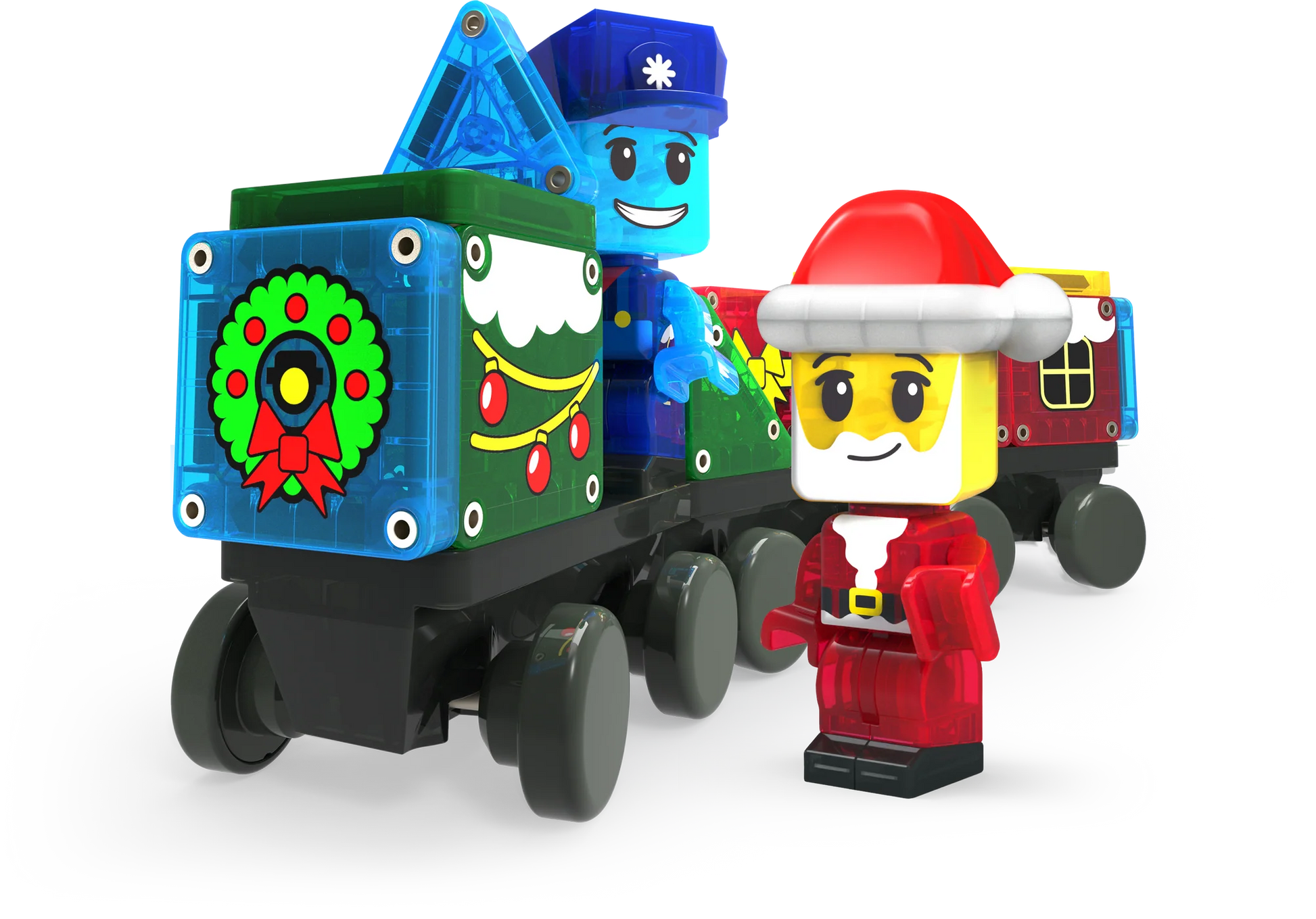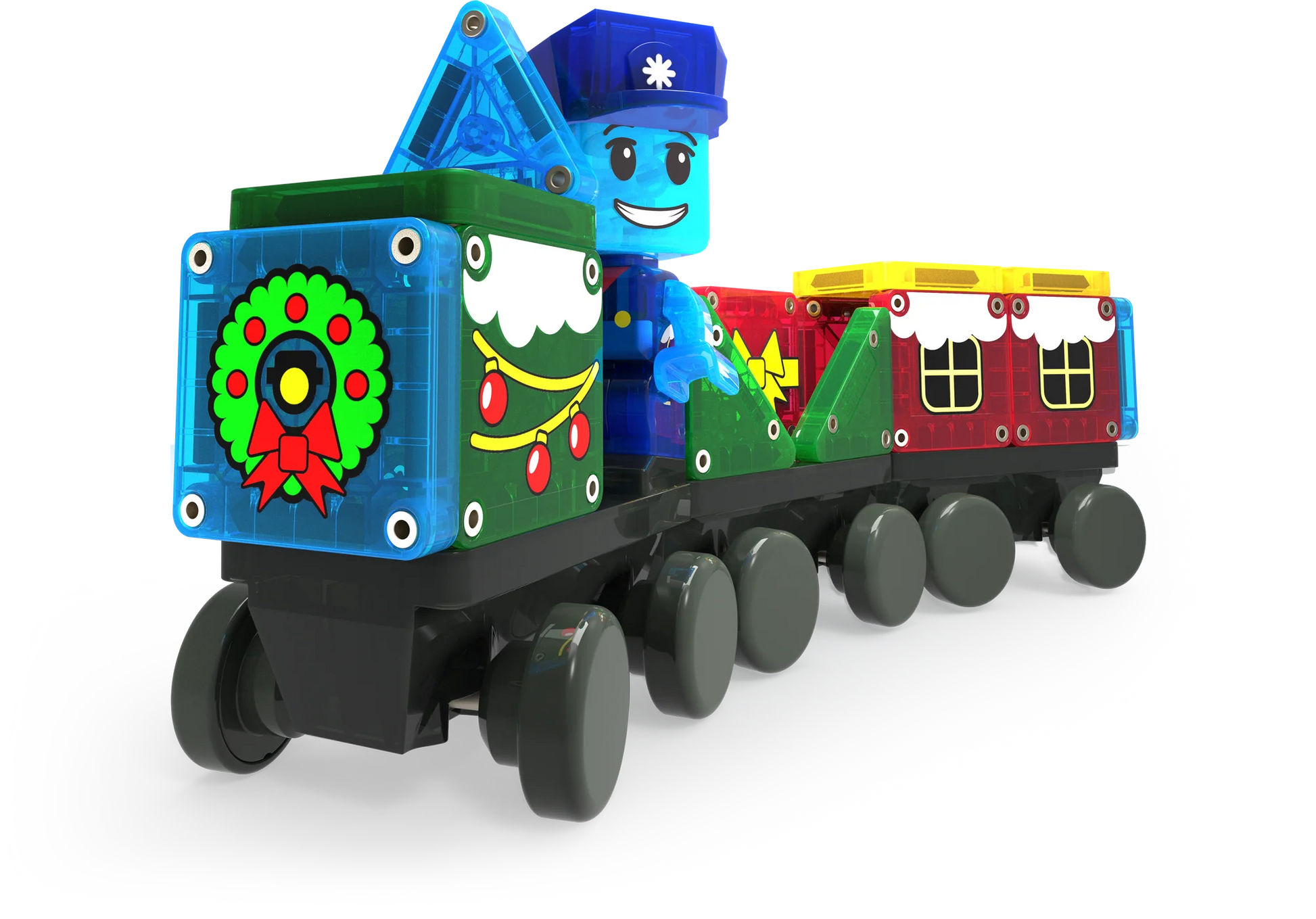 34 nieuwe feestelijke MAGNA-TILES, inclusief een Kerstman- en Conducteur-figuur, en een microChassis.