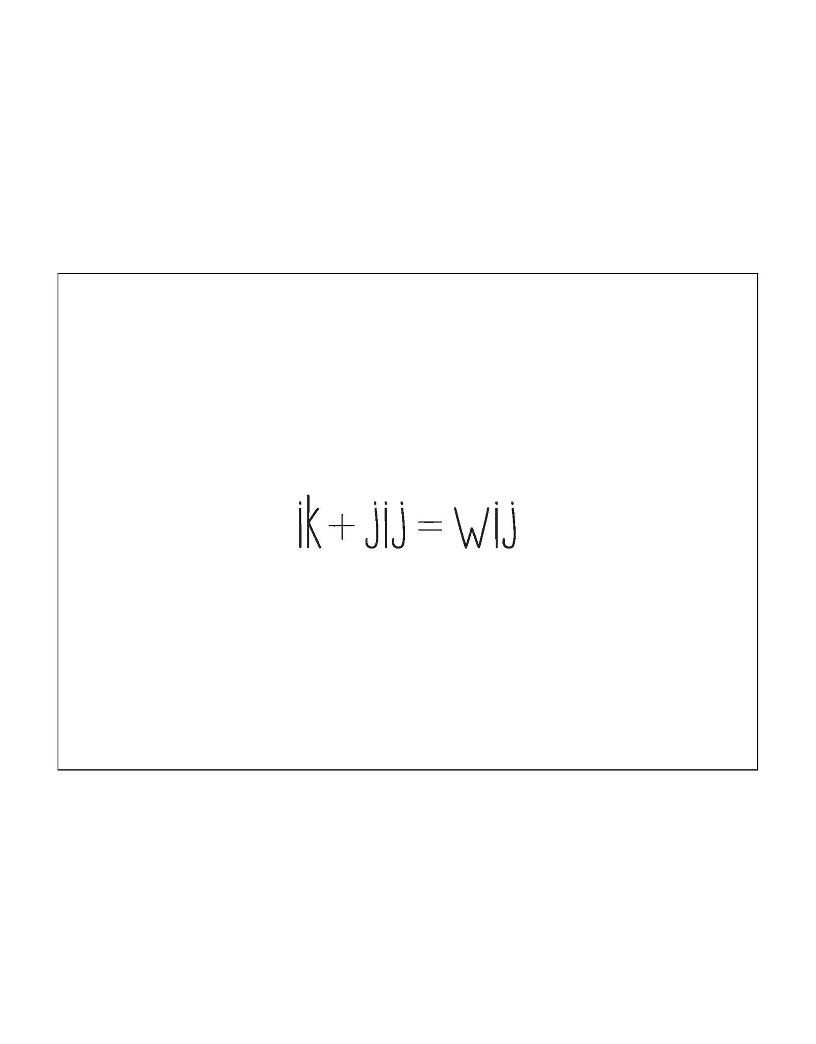 Hoera! Je zus, neef, collega, buurvrouw, broer of kennis is in verwachting en dat behoeft een kaartje! De tekst Ik + Jij = Wij staat symbool voor een zwangerschap en daarmee is de kaart "Ik, Jij, Wij" ideaal om te geven zodra iemand een aankondiging heeft gedaan! De kaart is afgewerkt met matte laminaat aan de voorzijde én wij hebben eventueel een bijpassende enveloppe beschikbaar.