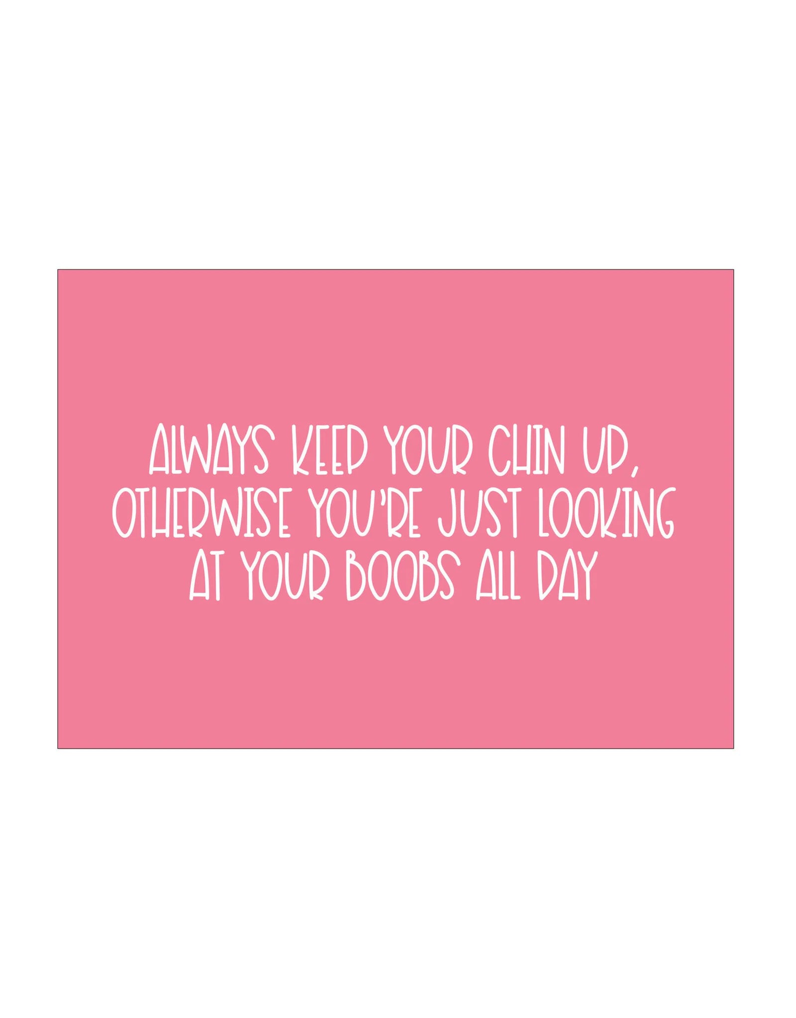 Met een dikke knipoog iemand een hart onder de riem steken? Dat doe je met de postkaar "keep your chin up" die zegt: Always keep your chin up, otherwise you're just looking at your boobs all day. Of ter wijl; Hou je hoofd geheven, want anders staar je ook maar de hele dag naar je borsten. De kaart is afgewerkt met matte laminaat aan de voorzijde én wij hebben eventueel een bijpassende enveloppe beschikbaar.